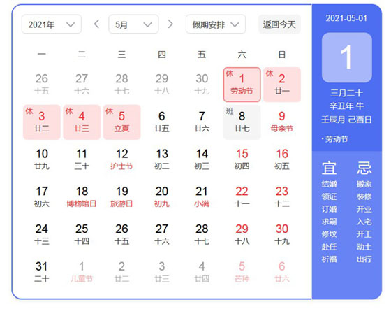 2021年05月01日---2021年05月05日,共计5天。