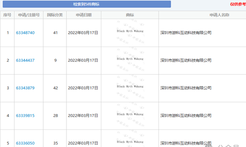 不仅如此,深圳游科互动还申请注册了《黑悟空》的英文名“Black Myth Wukong”、“Black Myth ”等商标。不过英文商标比较克制,只申请了五个游戏相关的关键类别。